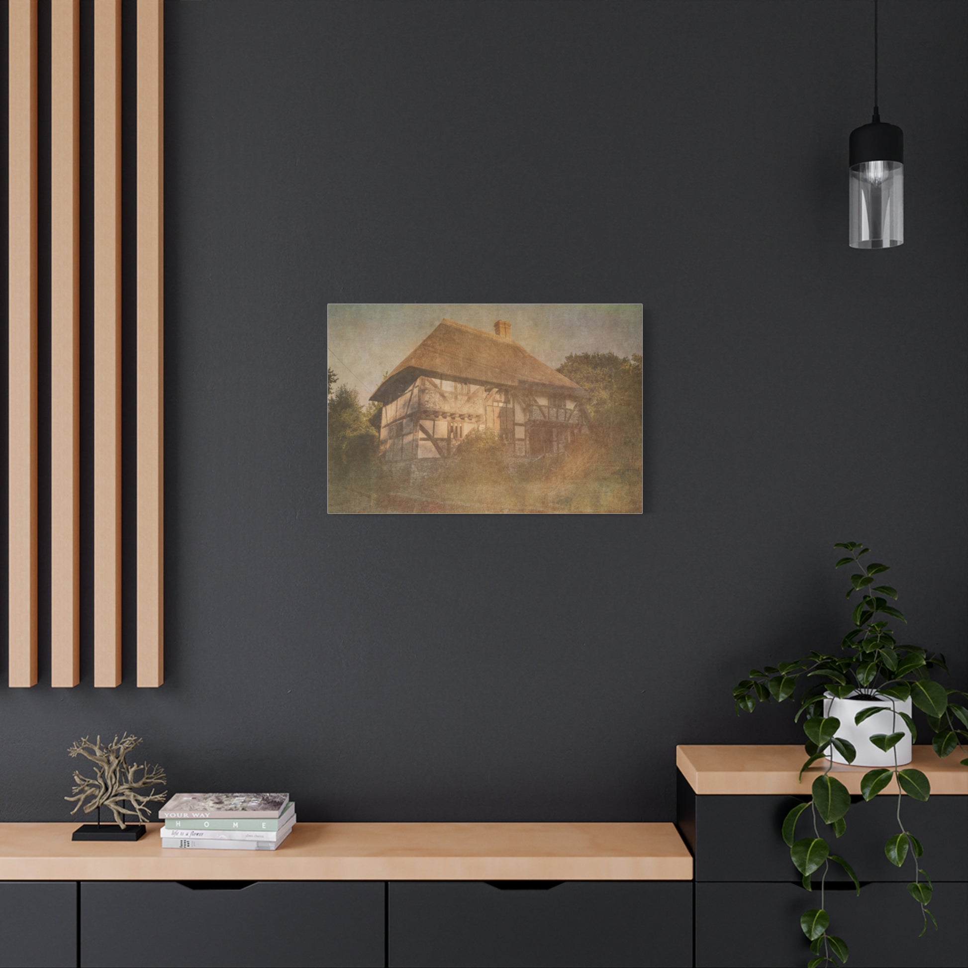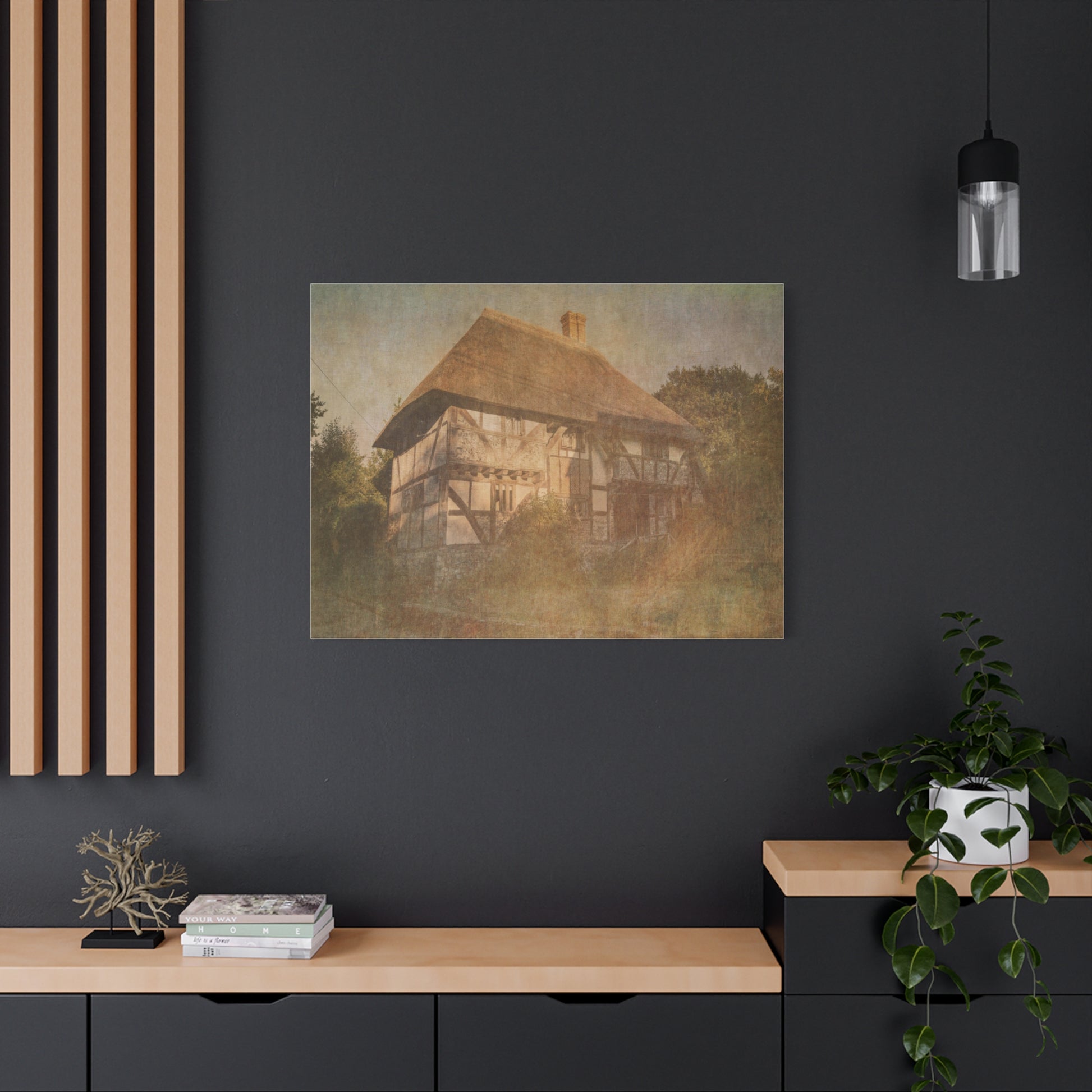 This image showcases a picturesque Tudor-style cottage with a distinctive thatched roof, nestled amidst lush greenery. The building's half-timbered construction is clearly visible, with exposed wooden beams creating a charming pattern against white-washed walls. A large chimney rises from the steep, golden-hued thatched roof, adding to the cottage's rustic appeal. The surrounding vegetation appears slightly overgrown, lending an air of tranquility and seclusion to the scene. The photograph has been processed to give it a vintage, textured appearance, reminiscent of an old painting or aged photograph. Soft, warm tones dominate the image, creating a nostalgic and romantic atmosphere. The composition draws the viewer's eye to the cottage, which stands as a testament to traditional English countryside architecture. This idyllic scene captures the timeless beauty of rural life and would appeal to those interested in historic homes, countryside aesthetics, or rustic interior design inspiration.Place your artwork, photos, or creative projects on a canvas you'll be proud to use. Each matte canvas comes with back hanging already included for convenient placement. The frame is made with profile radial pine that is ethically sourced from renewable forests. .: Materials: cotton and polyester composite (canvas), pine wood (frame) .: Soft rubber dots on bottom back corners for support .: Back hanging included .: Inner frame made with radial pine sourced from renewable forests